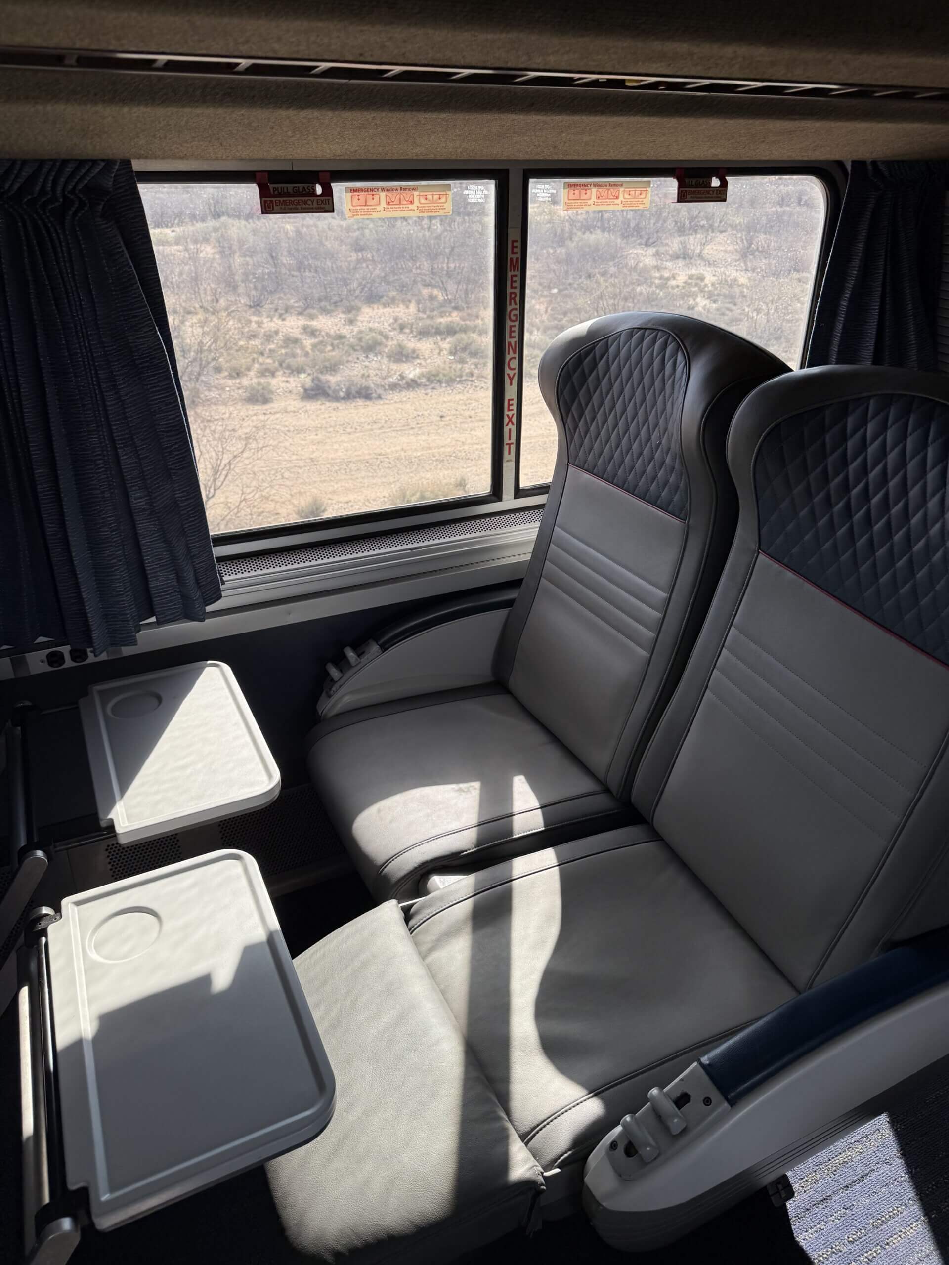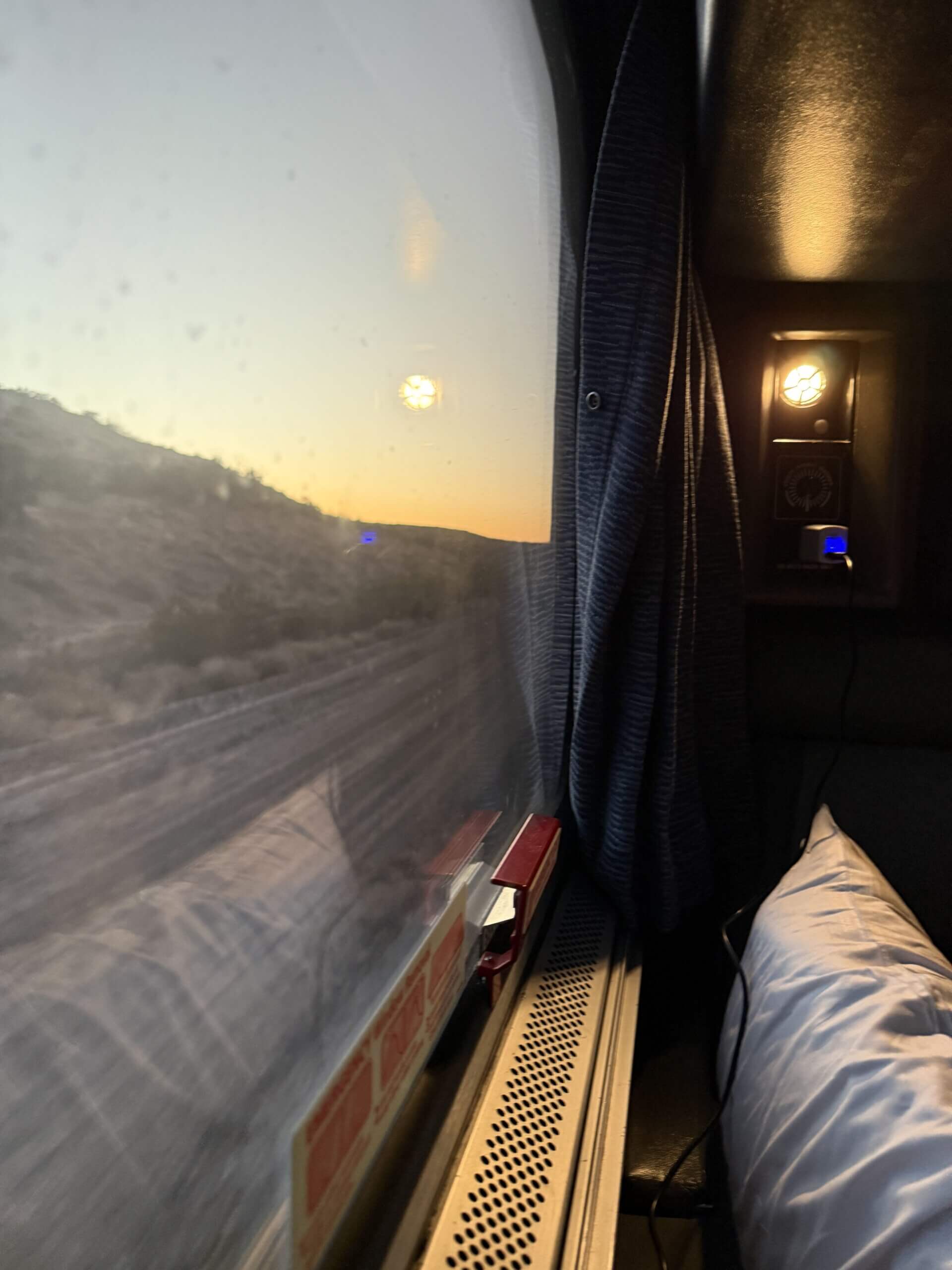 My partner and I had always been curious about the experience of riding on a train overnight, and were particularly keen on trying out a sleeper car. So, we took a look at schedules and budgets, and after getting over the shock of how pricey and slow train travel seems to be in comparison to flying or driving, settled on a trip from Austin, Texas to Tucson, Arizona and back. We reserved a “roomette” which is a two-person sleeping car with an overhead bunk bed and two recliners that convert to a second mattress at night. Sleeper car tickets also include three meals a day and one alcoholic beverage with dinner.